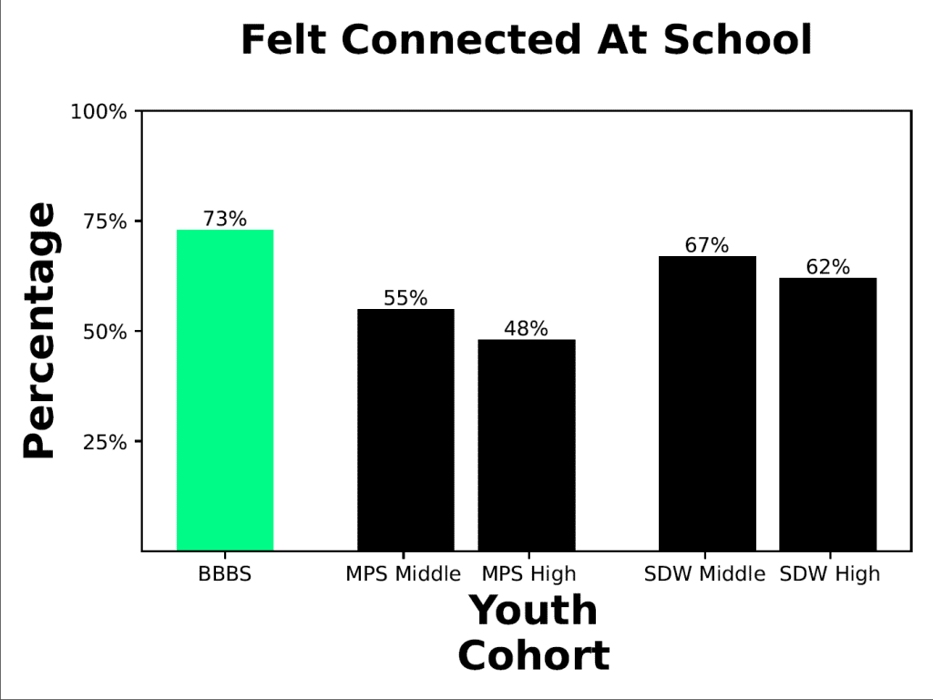 Big Brothers Big Sisters of Metro Milwaukee (BBBMM) youth are outperforming their peers in local school districts when it comes to school engagement. While only 51.5% (avg) of Milwaukee Public Schools (MPS) students report feeling connected to their school, a remarkable 73% of BBBSMM youth say they feel strongly connected to theirs. This sense of belonging is a key factor in long-term academic and personal success.