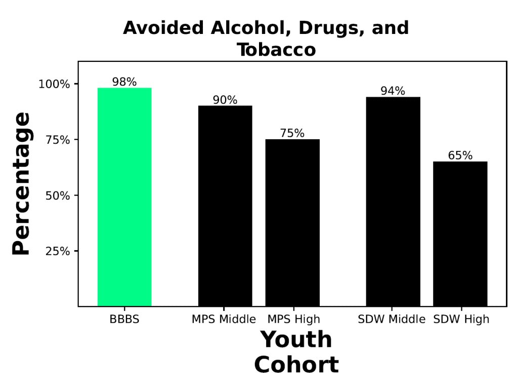 The presence of a trusted mentor helps BBBSMM youth make safer, healthier decisions. Just 2% of BBBSMM youth reported engaging in substance use, compared to 17.5% (avg) of MPS students and 20% (avg) of School District of Waukesha (SDW) students.